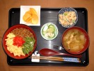 きの子ごはん(刻み海苔)、味噌汁(白菜、あげ)、茄子の揚げびたし(三つ葉)、酢の物(キュウリ)、玉子焼き、つぼづけ昆布、フルーツ:バナナ(ブルーベリーソース・生クリーム) |