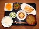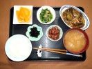 ごはん、味噌汁(白菜、なめこ)、ほっけの塩焼き、大根とシーチキン煮(大根葉)、揚げ出し豆腐、かぶとキュウリ梅しそ漬け、フルーツ:バレンシアオレンジ |