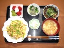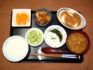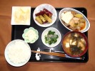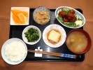 ごはん、味噌汁(白菜、あげ)、ミートコロッケ&まぐろかつ(千切りキャベツ、特製ソース)、ひじき煮(人参、あげ、大豆、グリーンピース)、キュウリの酢の物、たまご豆腐、フルーツ:リンゴ |
