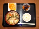 ごはん、味噌汁(豆腐、あげ、わかめ、長ネギ)、すき焼き風煮(豚肉、白菜、しらたき、椎茸、長ネギ、豆腐)、ブロッコリー胡麻ドレがけ、大学芋(黒ごま)、大根の柚子漬け、フルーツ:リンゴ(ふじ) |