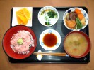 まぐろ丼(寿飯、キュウリわさび乗せ、刻み海苔)、味噌汁(白菜、なめこ)、田舎煮(大根、人参、こんにゃく、あげ、竹輪、さつま揚げ)、ほうれん草やまかけ、フルーツ:バレンシアオレンジ |