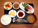 ごはん、味噌汁(豆腐、なめこ、三つ葉)、刺身盛り合わせ(豊洲厳選本まぐろ、タイ、大根つま、わさび、大葉、パセリ)、金平ごぼう(白すり胡麻)、厚焼きたまご、フルーツ:杏仁豆腐(みかん缶、キウイフルーツ、イチゴ) |