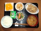 ごはん、味噌汁(大根、なめこ)、豚肉の生姜焼き(玉ネギ)、がんも含め煮、小松菜と人参の胡麻和え、丸美屋たまごふりかけ、フルーツ:和歌山県産ネーブルオレンジ |