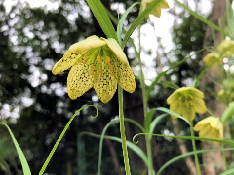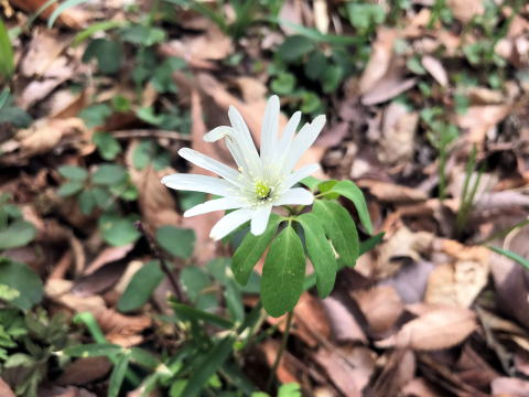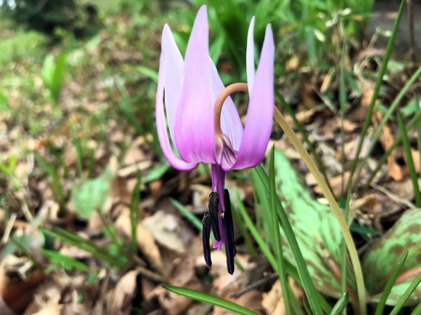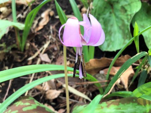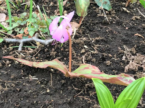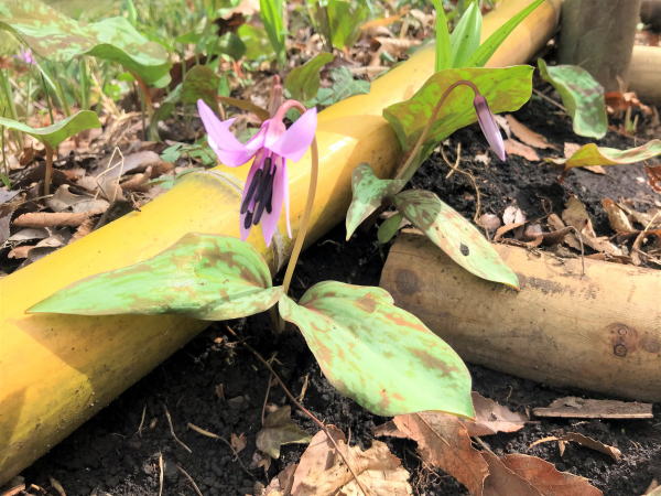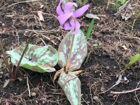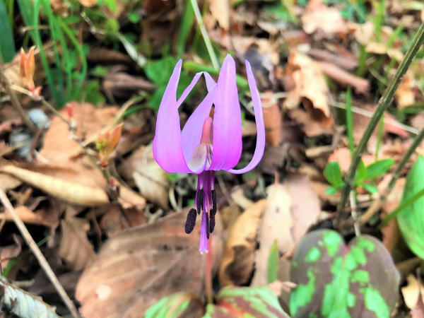 カタクリ(片栗:多年草) 古語では「堅香子(かたかご)」と呼ばれ 1-2枚つく葉にはまだら模様になっている。