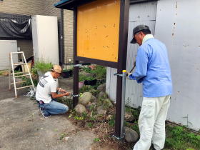 今日は、10時から沼町内会の外看板の作成取り付けを6役の皆さんと行いました。今使用している掲示板を修理して見違えるように綺麗になりました。また今年度、新しい掲示板を購入し、沼町内会館前に設置する為、穴掘りから、セメントで固める等、これも全て手作業で行いました。作業は17時頃まで行い、無事取り付ける事ができ、終了しました。今日は、大変でしたが、皆さんと楽しく作業が出来て、本当に良かったです。これからもよろしくお願い致します。6役の皆さん、本当にお疲れ様でした。