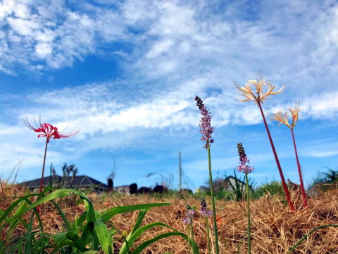 朝、うたなかまに向かう途中、きれいな青空と雲を見ました。また、送迎の道中、コスモスが綺麗に咲いていました。今が一番良い季節だと感じました。秋なんですね。