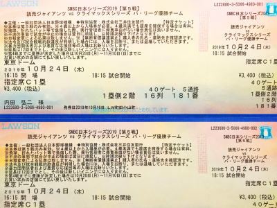 楽しみにみにしていた、日本シリーズ第5戦でしたが、ソフトバンクが「日本一」となり、残念ながら「幻のチケット」となってしまいました。座長の予想は3勝1敗で、第5戦で「巨人が日本一」と踏んでいましたが、4戦全敗で、完敗でした。戦力の差は認めなければいけませんが、ジャイアンツ戦では、今年1年楽しませて貰いました。来年も熱い戦いを楽しく野球観戦したいと思います。しかし、残念だったなぁ~。