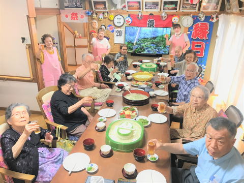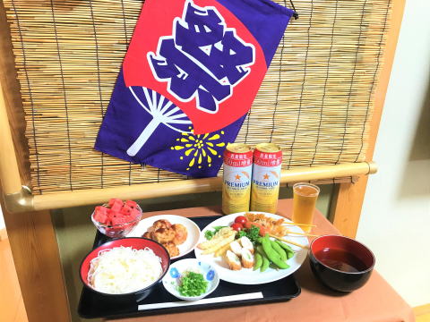今日から始まりました。8月行事「第9回うたなかま夏祭り」。今年も世間では、「夏祭りが中止」となっている中、「うたなかま」では何とか皆さんに「夏」を味わって頂きたいとの思いで開催致しました。夏祭りの演目:昼食:夏祭り食(メニューは、ホームページ参照)では「ノンアルコールビール」で乾杯して、お腹いっぱい召し上がって頂きました。その後、ゲーム大会「①ヨーヨー釣り②スーパーボールすくい③輪投げ④ボール投げ)を行いました。「うたなかま」は景品もれなくですので、皆さんそれぞれの性格が丸出しで、お腹を抱えながら大笑いして、大変盛り上がりました。15時のお茶の時間には、ふわっふあの「かき氷」(①イチゴ②メロン④レモン⑤練乳⑥あずき)を楽しんで頂きました。あっという間の楽しい1日をお過ごし頂けたかと思います。明日も行います。