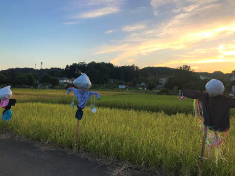 送迎の帰り道、城山町に「懐かしい案山子があるよ」と教えて頂き、見に行って見ました。「夕焼けに案山子」、「懐かしい風景」に癒されました。