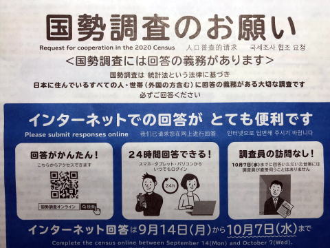 国勢調査の回答用紙が届きました。今はとても便利です。インターネットで回答が出来るとの事で、「パソコン」で簡単に回答が出来ました。「うたなかまの皆さん」の回答の進捗状況も確認したいと思います。