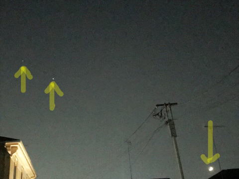 今日は、月に木星、土星が最接近するとの事で、19時過ぎに南から南西方向の夜空を見上げました。矢印左から土星、木星、月と斜めに肉眼で見えました。とてもラッキーでした。