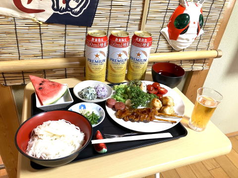 今日から、12回目の「8月行事:うたなかま夏祭り」が始まりました。午前中は、3曲歌唱して頂き、昼食は、皆さんの元気な掛け声で、「乾杯」から始まり、「うたなかま夏祭り食」を楽しんで頂きました。その後、「ヨーヨー釣り」、「スーパーボールすくい」、「輪投げ」、「ボール投げ」で大変盛り上がりました。15時のお茶の時間には「カキ氷」を「イチゴ」、「メロン」、「あずき」で楽しんで頂きました。と言う事で、あっと言う間の楽しい1日をお過ごし頂き、大変満足して頂けたかと思います。明日も盛り上がりますよ。