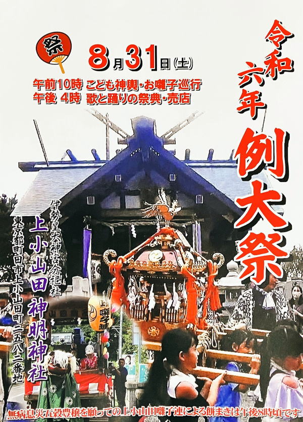 今日は、「上小山田神明神社さん」の「例大祭奉納演芸」が開催される予定でしたが、台風10号の影響で、お祭り全てが中止となってしまいました。とても残念ですが、皆さんの安全を考えれば適切な判断だったと思います。来年は、無事に開催され、歌謡ショーをさせて頂きたいと思います。よろしくお願い致します。