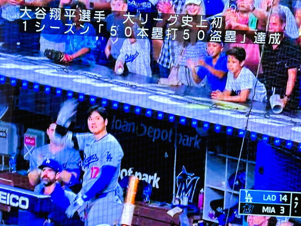 大谷選手の「ホームラン50、盗塁50」の大リーグ史上初の大記録が掛かった試合を見ようとテレビのチャンネルを合わせたら、何とドンピシャでホームランを打ちました。テレビのスーパーも出て、凄い瞬間を見る事が出来ました。これからの活躍が本当に楽しみです。