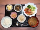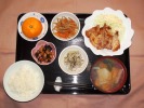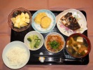 ごはん、味噌汁(白菜、しいたけ、あげ)、とり肉塩だれ漬け焼き(レタス、ブロッコリー、マヨネーズ)、茄子炒め煮、もやしと竹輪の酢の物、白花豆煮、フルーツ:りんご |