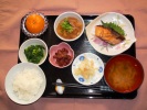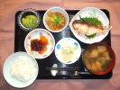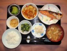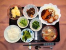 ごはん、味噌汁(豆腐、あげ、ワカメ、長ネギ)、さわら塩こうじ焼き、豚肉と大根の煮物、ブロッコリーのごまドレ和え、さつま芋天ぷら、フルーツ:リンゴ |