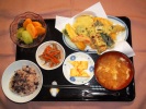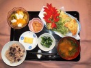 お赤飯、味噌汁(なめこ、豆腐、三つ葉)、天ぷら盛合せ(さつま芋、かぼちゃ、茄子、ピーマン、赤パプリカ、春菊、竹輪磯部)、玉子焼き、小松菜・じゃごの和え物、白花豆煮、 フルーツ:杏仁豆腐(キュウイ、みかん、マンゴー、パイナップル) |