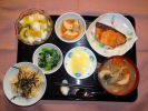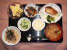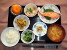 ごはん、味噌汁(白菜、あげ)、鮭塩焼き、車ふと野菜のたまごとじ、小松菜胡麻和え、なめ茸と大根のおろし和え、白菜漬物、フルーツ:キュウイフルーツ |