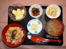 五目ごはん(きざみのり)、けんちん汁(豆腐、こんにゃく、人参、牛蒡、里芋、しめじ、長ネギ)、ぶりの照り焼き、がんもどきの煮物、小松菜じゃご和え、大根べったら漬け、杏仁フルーツ(キュウイ、黄桃缶) |