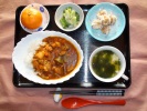 茄子ポークカレー、鶏がら中華スープ(わかめ、豆腐、コーン)、ミートシュウマイ、ブロッコリーの胡麻和え、フルーツ:みかん |
