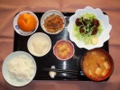 ごはん、味噌汁、(かぶ、かぶ葉、あげ)、ポークソテー(キャベツ添え)、金平ごぼう、白菜・キャベツのゆかり和え、ひじき大豆煮(人参、こんにゃく)、フルーツ:みかん |