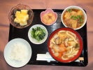 ごはん、煮込みうどん(豚肉、白菜、人参、椎茸、しめじ、あげ、長ネギ)、肉じゃが(玉ネギ、しらたき、豚肉、グリーンピース)、小松菜とじゃこの和え物、白花豆煮、フルーツ:りんご |