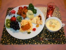 オムライス風チキンライス、コーンクリームスープ、鶏唐揚げ、ブロッコリーサラダ、粉ふき芋、サニーレタス、チーズピザ、グレープフルーツ、キュウイ、イチゴ、ぶどう