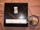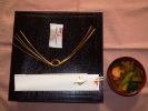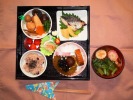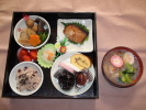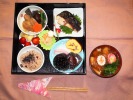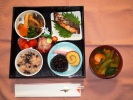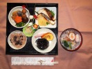 お赤飯、雑煮(大根、鶏肉、人参、小松菜)、いなだ塩焼き(大葉)、煮しめ(ハツ頭、牛蒡、こんにゃく、椎茸、人参、菜の花)、大根なま酢、紅白かまぼこ、伊達巻、黒豆、栗渋皮煮、フルーツ:リンゴ、イチゴ |