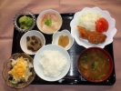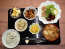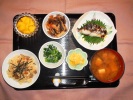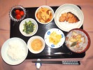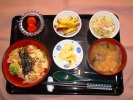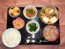 ごはん、味噌汁(じゃがいも、玉ネギ)、焼き肉(豚肉、キャベツ、玉ネギ、カイワレ)、かぶカニあんかけ(枝豆添え)、うづら豆煮、大根べったら漬け、フルーツ:蜜リンゴ |