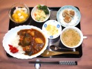 ポーク茄子カレー(福神漬け添え)、オニオンスープ(パセコン)、コールスローサラダ(ブロッコリー添え)、竹の子・椎茸しゅうまい、フルーツ:杏仁マンゴープリン |