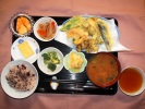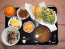 お赤飯、味噌汁(豆腐、なめこ、三つ葉)、天ぷら盛合せ(さつま芋、かぼちゃ、ナス、赤・緑・黄ピーマン、舞茸、磯部竹輪)、ブロッコリー胡麻和え、根葉煮物(レンコン、牛蒡、人参、胡麻)、玉子焼き、山東菜漬物、フルーツ:メキシカンメロン |