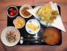 赤飯、味噌汁(豆腐、なめこ、三つ葉)、天ぷら盛合せ(さつま芋、かぼちゃ、ピーマン、ナス、舞茸、レンコン、竹輪磯辺焼)、根葉類煮物、山東菜、フルーツ:イチゴ |