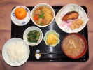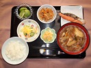 ごはん、味噌汁(白菜、あげ)、ぶりの照り焼き(白いんげん豆)、肉じゃが(豚肉、しらたき、人参、玉ネギ、グリーンピース)、ほうれん草みぞれ和え(大根おろし、なめたけ和え)、山東菜漬物、フルーツ:みかん |