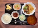 鶏ごぼうご飯、味噌汁(豆腐、なめこ、長ネギ)、いなだ塩こうじ焼き(大葉添え)、わらび煮物(つきこんにゃく、あげ、竹輪、人参、さつま揚げ)、ほうれん草とじゃごこの和え物、山東菜漬物、フルーツ:マンゴープリン |