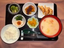 ごはん、豚汁(里芋、牛蒡、人参、大根、こんにゃく、しめじ、舞茸、豆腐、長ネギ)、ぶりの照り焼き、仙台ふと野菜たまごとじ、小松菜胡麻和え、なめ茸大根おろし、山東菜漬物、フルーツ:イチゴ |