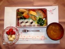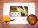たわらゆかりおにぎり、味噌汁(白菜、なめこ、しめじ)、本まぐろ漬け焼き、煮しめ(竹の子、牛蒡、椎茸、こんにゃく、人参、がんもどき、絹さや、玉子焼き、白花いんげん豆、ほうれん草ジャゴ和え、フルーツ:バナナ、イチゴ |