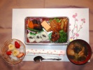 たわらおにぎり、味噌汁(ワカメ、おふ、あげ、長ネギ)、鶏唐揚げ(フライドポテト、レタス)、煮しめ(こんにゃく、椎茸、牛蒡、さつま揚げ、人参、いんげん)、玉子焼き、菜の花和え物、うづら豆煮、フルーツ:杏仁豆腐(バナナ・イチゴ) |