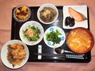 ごはん、味噌汁(玉ネギ、玉子)、鮭の塩焼き(キャベツ、人参の和え物)、ポテトサラダ(ローズハム、キュウリ。人参、玉子)、昆布やわらか煮(きざみ生姜)、白花いんげん豆、辛子菜漬物、フルーツ:リンゴ |