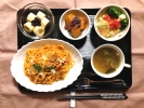 スパゲティーナポリタン、コンソメスープ(春雨、ベーコン、レタス)、コールスローサラダ(人参、きゅうり、キャベツ、ブロッコリー、トマト)、かぼちゃいと子煮、フルーツ:バナナブルーベリーソース |