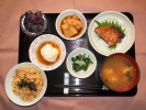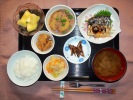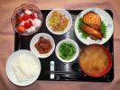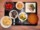 ごはん、味噌汁(茄子)、さばの塩焼き(大葉添え)、肉じゃが(豚肉、きゃがいも、玉ネギ、しらたき、グリーンピース)、竹の子土佐煮(京都宇治産)、キャベツ・人参の胡麻和え、ワカサギ佃煮、フルーツ:生パイナップル |