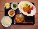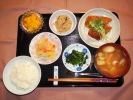 ごはん、味噌汁(なめこ、白菜)、チキンカツ(キャベツ、トマト、スパゲティサラダ)、豚肉と大根煮(大葉添え)、菜の花辛子和え、ふき煮、柚子大根漬け、フルーツ:バナナブルーベリーソースがけ |