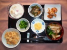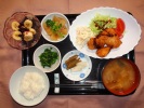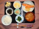 ごはん、味噌汁(なめこ、椎茸、おふ、三つ葉)、フライ2種(鶏フライ、アジフライ、キャベツ、スパゲティサラダ、トマト)、菜の花辛し和え、大豆五目煮、フルーツ:リンゴ |