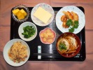 とりごぼうご飯、そうめん汁(椎茸、紅かまぼこ、長ネギ、かぶ葉)、揚げギョーザ、シュウマイ(パセリ)、菜の花辛子和え、玉子豆腐、白花インゲン豆、フルーツ:生パイナップル |