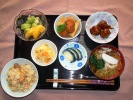 きのこ炊き込みご飯、味噌汁(玉ネギ、玉子)、鮭塩焼き(そら豆煮)、茄子しぎなべ、からし菜和え物(おかか添え)、からしな漬け、フルーツ:りんごコンポート(レーズン入) |