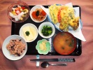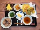 お赤飯、味噌汁(なめこ、豆腐、三つ葉)、天ぷら盛合せ(さつま芋、かぼちゃ、茄子、舞茸、ピーマン(三色)、竹輪いそべ、竹の子土佐煮、野ぼう菜辛子和え、玉子焼き、フルーツ:生パイナップル |