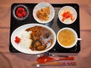 ポーク茄子カレー、オニオンコンソメスプ、コールスローサラダ、竹の子おかか煮、フルーツ:イチゴ(練乳がけ) |