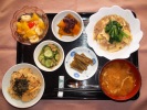 お赤飯、味噌汁(なめこ、豆腐、三つ葉)、天ぷら盛合せ(さつま芋、かぼちゃ、いんげん、舞茸、ピーマン、赤・黄パプリカ、竹輪磯部揚げ)、根菜煮物、菜の花辛子和え、たまご豆腐、大根ぬか漬け、フルーツ:杏仁フルーツ(イチゴ、バナナ、キュウイ) |