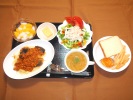 スパゲティナスミートソース(牛・豚ひき肉、揚げ茄子)、ハーフパン、ポテトフライ、アプリコットジャム、オニオンスープ(パヤコン)、チキンサラダ(グリンリーフ、きゅうり、鶏ムネ肉、パプリカ、トマト、胡麻ドレ)、玉子焼き、フルーツ:杏仁豆腐 |