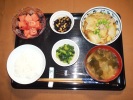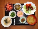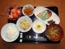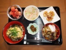 ごはん、味噌汁(茄子、みょうが)、とり唐揚げ(2色トマト)、野菜たまごとじ(キャベツ、人参、玉ネギ、たまご)、ひじき五目煮(枝豆入り)、酢の物(キュウリ、ワカメ、カニかま)、フルーツ:スイカ |