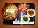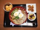 冷うどん(きゅうり、椎茸、紅かまぼこ、カニかま、あげ玉、煮あげ、みょうが、カイワレ、ゆで玉子、万能ネギ)、揚げシューマイ、さつま芋のレモン煮(レーズン入り)、フルーツ:レッドメロン |